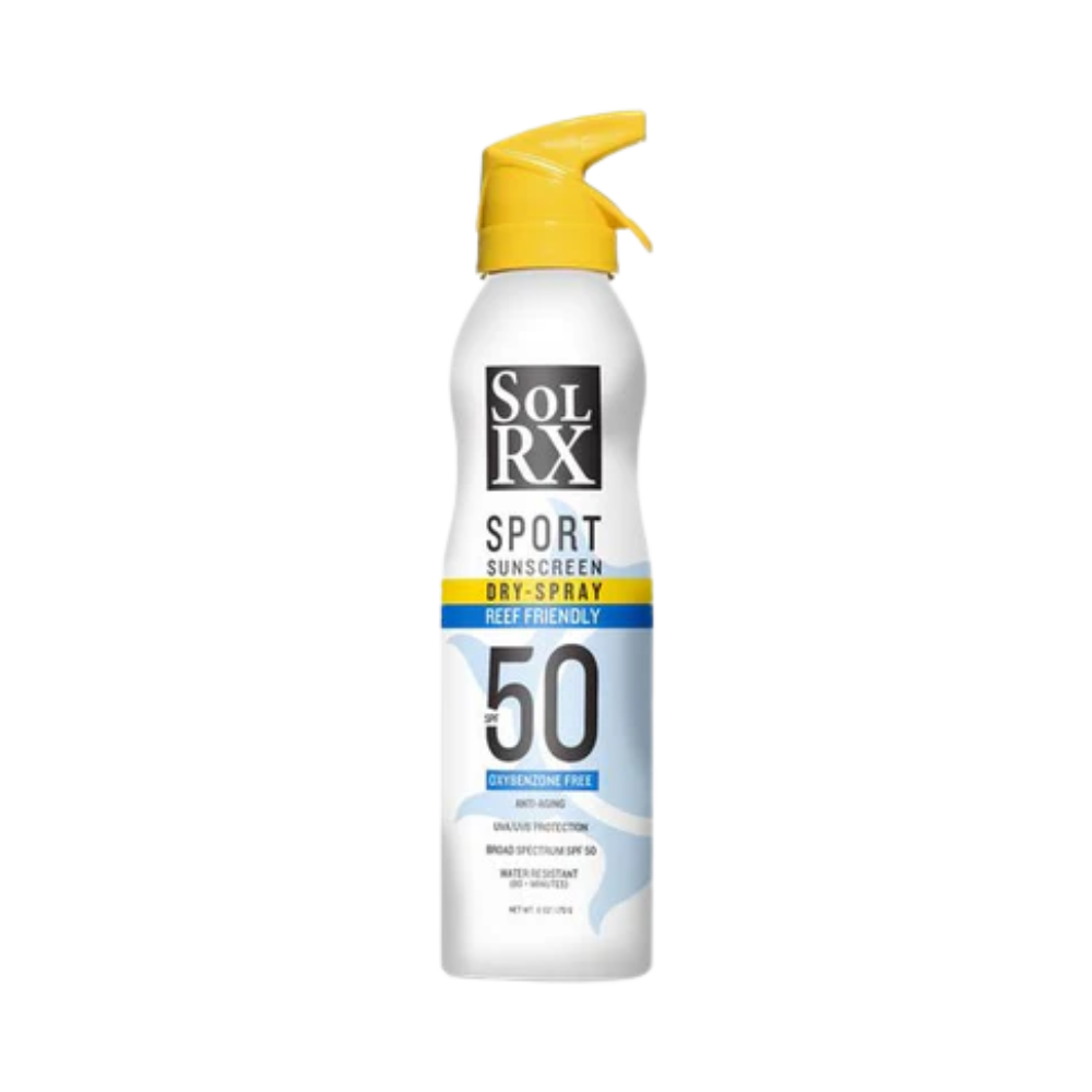 SolRX's New SPORT SPRAY SPF 50 Continuous Dry-Spray Sunscreen is a REEF/OCEAN FRIENDLY AND OXYBENZONE/OCTINOXATE FREE formula. This SPF 50 Spray sunscreen provides perfectly balanced UVA/UVB protection for athletes and anyone who wants to be in the outdoors. This Anti-Aging formula has NO Fragrance or Parabens. Designed with the 360 locking continuous spray with Push/Pull trigger for easy spray application at any angle.